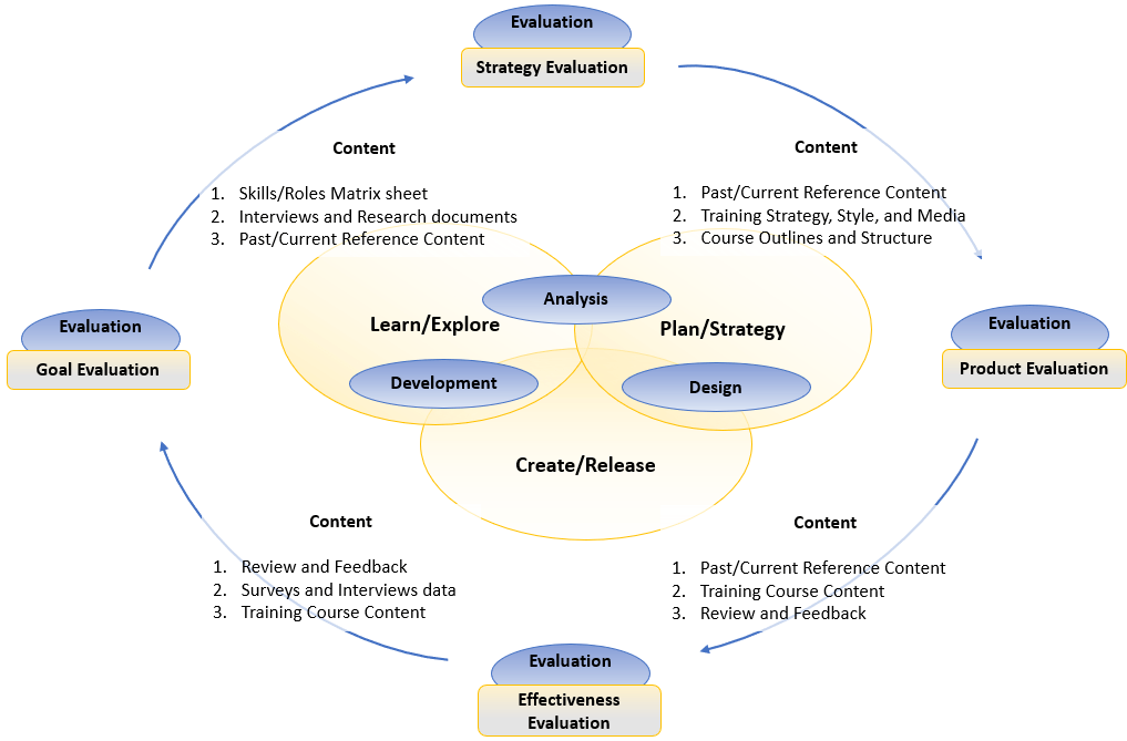 Cycles of Improvement – Cycles of Improvement refer to the iterative process of going through the content development steps (ADDIE framework), not necessarily in sequential order, until we achieve the final product. For example, while developing the content, we may end up revising the scope of the training or re-designing the course outlines. Or, while designing the course curriculum, we may go back to the client with more questions, and this may result in re-aligning our proposal for suggested training media, training methodologies, or course structure.